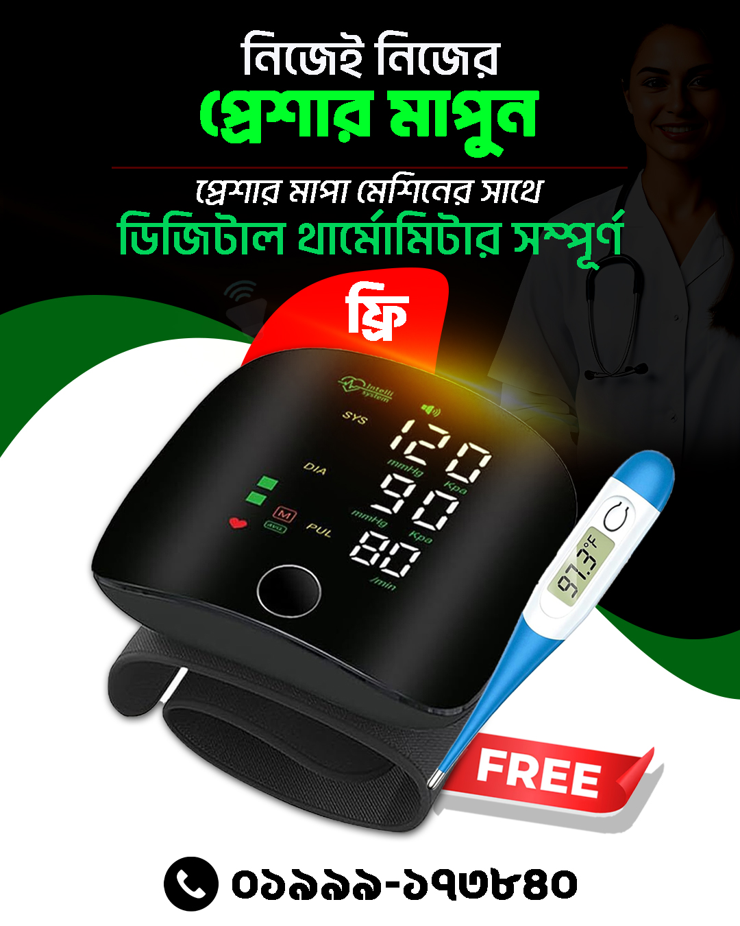 বাংলাদেশে বিভিন্ন ব্র্যান্ডের ডিজিটাল রিস্ট BP মেশিন পাওয়া যায়। কিছু মডেল USB চার্জেবল, আবার কিছু ব্যাটারি চালিত। আপনি চাইলে ফ্রি থার্মোমিটারসহও প্যাকেজ পেতে পারেন।